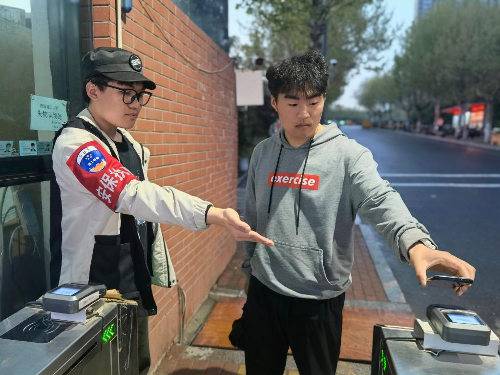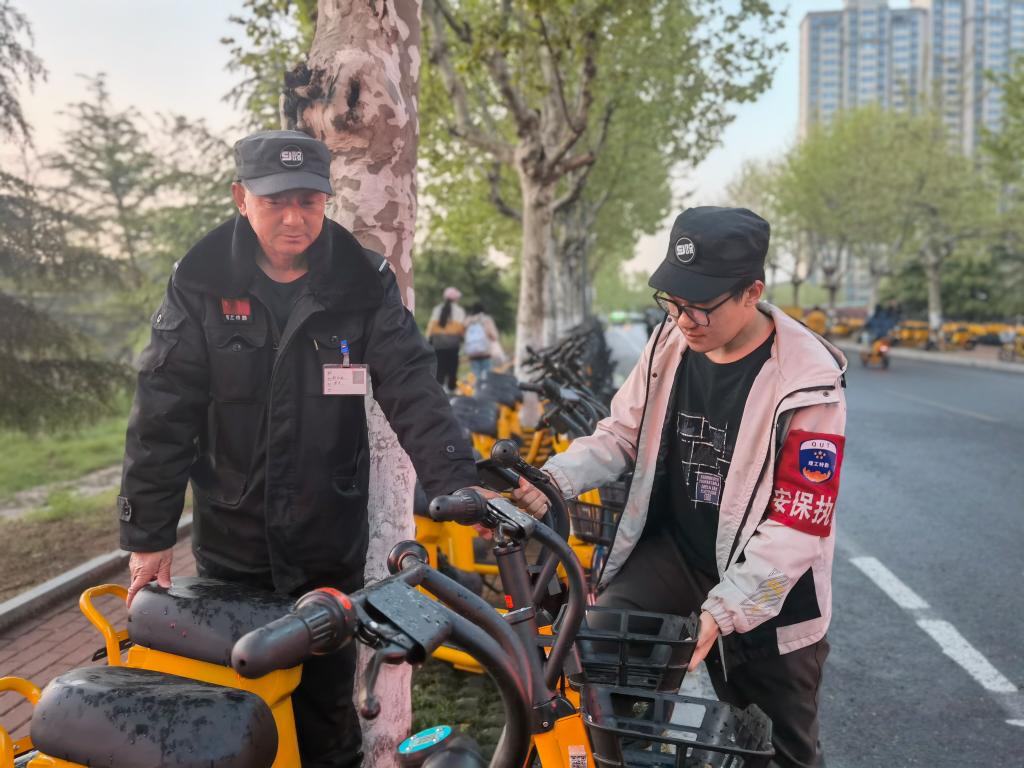 劳动体验志愿者电气201牟作浩真切地体验了一周的安保工作:“每天天刚朦朦亮就起床,与值了一夜班的保安大叔进行换班。除了对进出人员进行测温、查看假条、青理一码通,还要和保安大叔一起打扫校门卫生,对校园内的小黄车进行规整,维护安保工具,筛查学校围栏缺口等。”一周的体验生活,每天守护在校园与外界的交界处,牟作浩深刻体会到保安大叔对每一位学生的安全负责的奉献精神。