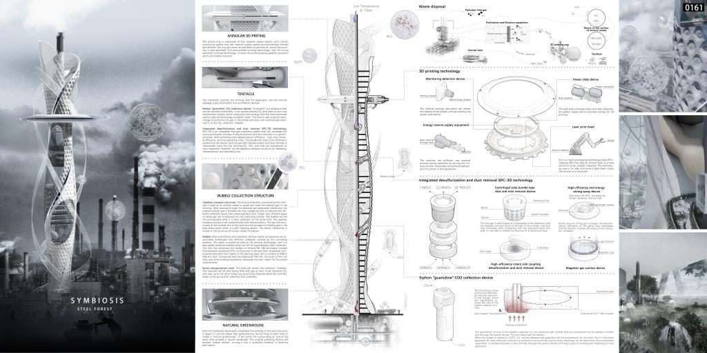 我校获奖作品《烟囱:共生》针对的是工业烟囱对环境的影响。Symbiosis摩天大楼依附在烟囱之上,烟囱为其提供能量和材料,Symbiosis摩天大楼吸收有害物。Symbiosis摩天大楼最开始只需要一个3D打印环,打印材料完全由烟囱燃烧的废物和植物纤维提供,从烟囱最底部开始螺旋上升环绕打印。随着Symbiosis摩天大楼的生长,其吸收烟囱产生有害物质的能力不断提高,减少烟囱的排放。当其达到最终形态,工厂烟囱将不再排出有害物,同时利用烟囱所产生的废弃热打造不同的植物温室,净化周围的空气,将烟囱变成与自然融合的共生建筑。实现“碳中和”。