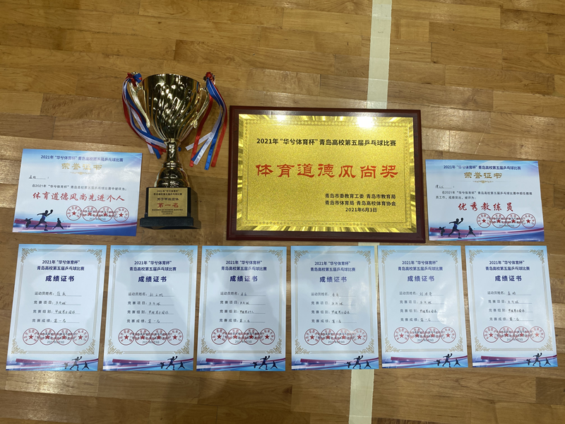 在日前结束的2021年“华兮体育杯”青岛市高校第五届乒乓球比赛中,我校学生乒乓球队获男子甲组团体冠军、男子单打亚军及体育道德风尚奖,孟硕获得道德风尚先进个人称号,谭文龙老师获评优秀教练员。