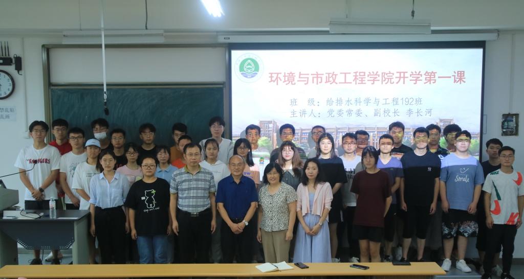 9月3日下午,党委常委、副校长李长河为环境与市政工程学院联系班级给排水192班全体学生讲授开学第一课。环境与市政工程学院党委书记马莉,党委副书记、副院长隋学智,学生工作办公室主任、团委书记花会娟,班主任何珊珊及给排水192班全体同学参加。