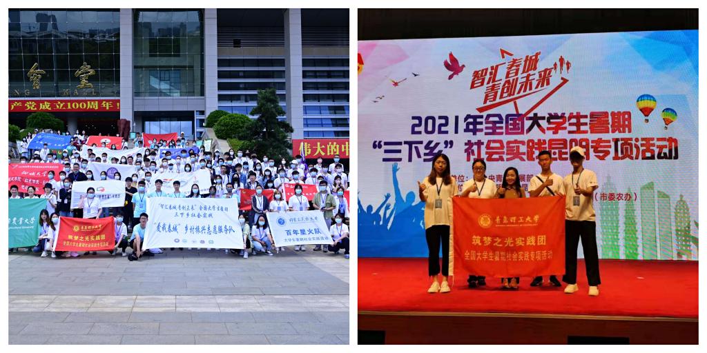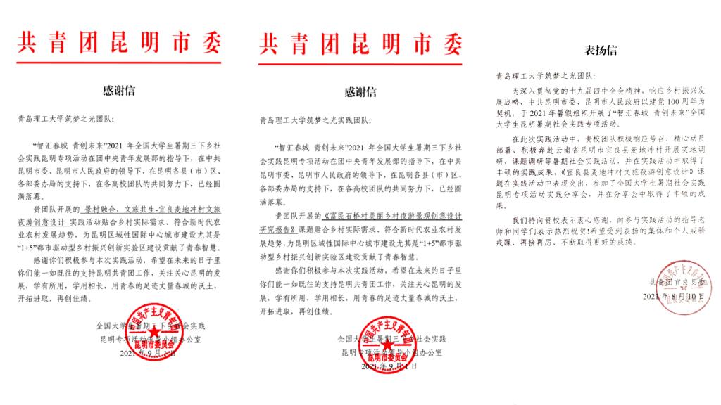 在团中央青年发展部的指导下,2021年全国大学生暑期“三下乡”社会实践专项活动在各地组织开展,青岛理工大学建筑与城乡规划学院“筑梦之光”实践团经过全国选拔入围并参加了“2021年‘智汇春城 青创未来’全国大学生昆明暑期社会实践专项活动”及“2021年全国大学生暑期社会实践玉溪专项活动”。团队由建筑与城乡规划学院于红霞教授担任指导老师,带领“筑梦之光”团队成员奔赴昆明宜良县麦地冲村、富民县石桥村、玉溪红塔区开展实践课题研究,并取得了丰硕成果。实践活动已圆满结束,团队在实践过程中表现突出,收到了共青团昆明市委和共青团宜良县委的两封感谢信和一封表扬信。