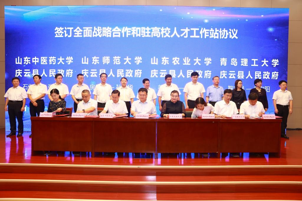 9月17日,山东省庆云县举行“才聚庆云”校地协同创新发展签约暨新时代企业家培养锻炼计划启动仪式。仪式上,青岛理工大学等省内8所高校与庆云县签订全面战略合作和驻高校人才工作站协议,我校党委常委、副校长齐德义及其他7所高校领导应邀参会,德州市人大常委会副主任、县委书记王晓东,县委副书记、县长吕德山,德州市委组织部副部长刘刚等参加签约活动。会议由庆云县委副书记、县长吕德山主持。