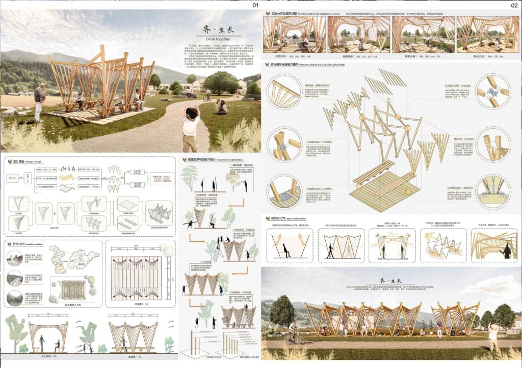 《齐·生长》团队设计根植于齐文化和齐长城的历史记忆,以齐文化内涵为切入点展开叙述,借助甲骨文中“齐”字如小麦破土而出和齐长城城墙一泻千里的气势,通过木件的交叠与重合,象征齐文化奋发向上的精神。主体部分两侧各由三个“V”形木构件交叠形成,加上主体内侧的座椅,使得建筑小品同时具备休憩、交流、观赏的功能。木构件的每一次拼接,都是对齐文化的编织。人置身于构筑物中,如身处麦田一般,仰望天空,可以感受到齐文化源源不断的活力与生生不息的精神内涵。