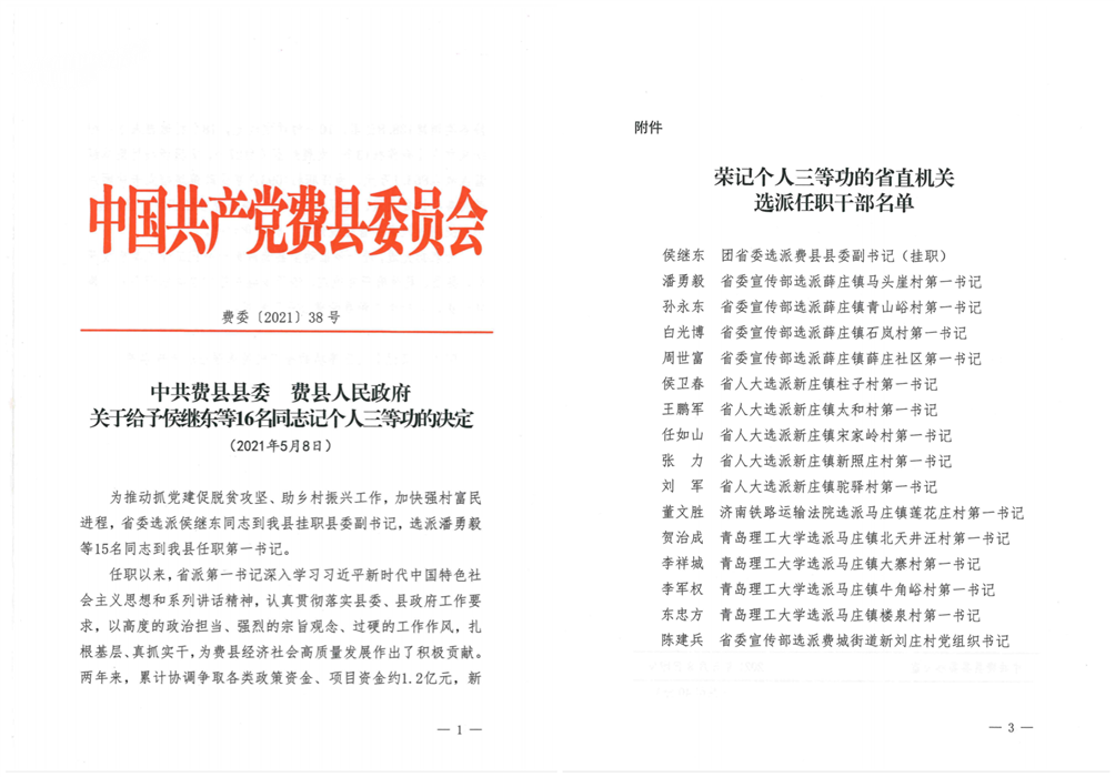 其中,我校驻费县马庄镇北天井汪村第一书记贺治成获评表现突出的第四轮第一书记。我校选派任职干部贺治成、李祥城、李军权、东忠方被费县县委、县政府记个人三等功一次,并授予“费县荣誉公民”称号。省派“加强农村基层党组织建设”工作队张国昌、吴磊、吴召同三人所在的莱州市总队、昌乐县高崖库区小队和费县费城街道小队及个人考核等次均被确定为“优秀”。