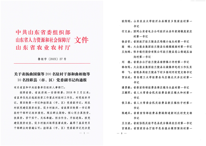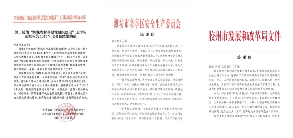 近日,我校收到省委组织部、省委选派“加强农村基层党组织建设”工作队领导小组办公室、费县县委、昌乐县人民政府、寒亭区安全生产委员会、胶州市发展和改革局送来的考核结果和感谢信,对我校挂职干部出色的工作表现给予了充分的肯定和认可。