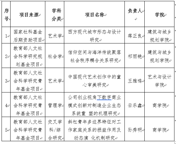 本年度立项项目中,按照学科统计,艺术学2项,管理学、社会学、交叉学科/综合研究各1项。按照学院统计,建筑与城乡规划学院2项、商学院2项、艺术与设计学院1项。