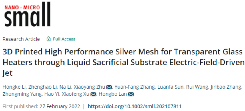 近日,我校机械与汽车工程学院朱晓阳老师指导博士研究生李红珂,硕士研究生李政豪和张厚超分别在国际权威期刊《Advanced Science》(影响因子:16.806),《Small》(影响因子:13.281),《ACS Applied Materials & Interfaces》(影响因子:9.229)以第一作者发表了电场驱动喷射微纳3D打印系列重要研究成果和突破性进展,青岛理工大学山东省增材制造工程技术研究中心为第一署名通讯单位,通讯作者均为朱晓阳副教授。