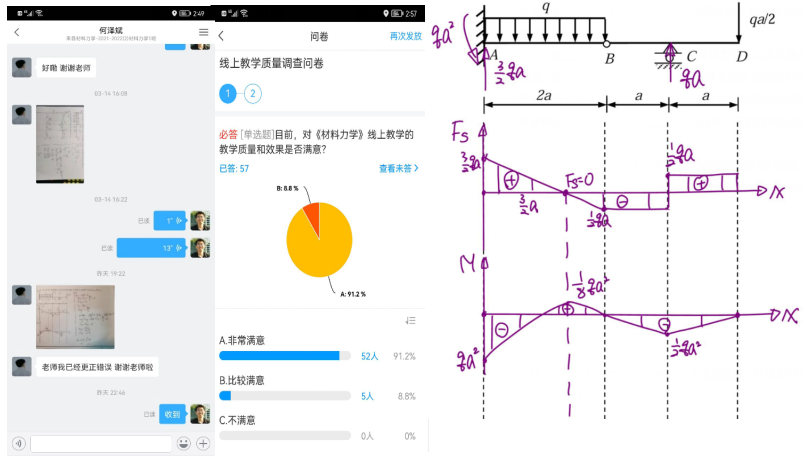 理学院李凯老师采用“超星一平三端+腾讯会议”三阶混合教学模式讲授材料力学课程,为保持知识点的内在逻辑,李凯老师重构教学体系,改变知识点讲解顺序,并以小故事的形式融入课程思政元素。针对材料力学公式多且繁杂等重难点,录制教学视频,建成线上教学资源,以便学生预习和复习,累计页面浏览量达17万次。
