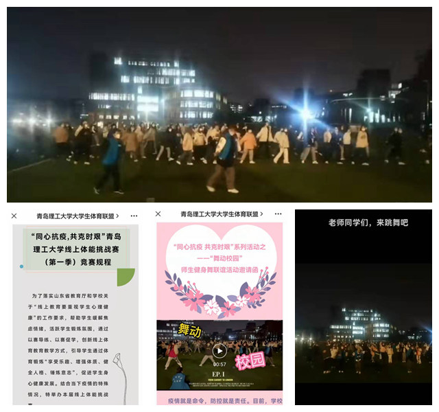 体育教学部在做好体育课程线上教学的同时,有序开展一系列线上体育活动,为同学们的身心健康保驾护航。大学生体育联盟发起“每天锻炼一小时!同心抗疫克时艰!”系列体育活动,体育教师在线指导,发挥体育社团的组织力和引导力,引领带动同学们积极参加体育锻炼。体育教学部青年教师拍摄居家健身视频,通过青岛理工大学微信公众号、视频号、抖音等新媒体平台,线上喊话同学们跟着视频锻炼,争当“健身达人”。