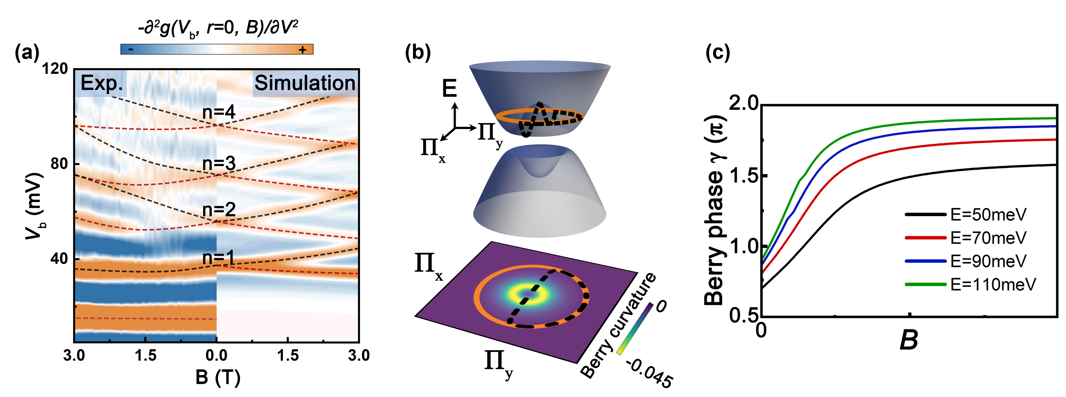 图1.(a)单层石墨烯量子点动量空间电荷轨迹示意图;(b)单层石墨烯量子点贝里相位随磁场的演化;(c)单层石墨烯量子点微分电导在磁场下的演化。