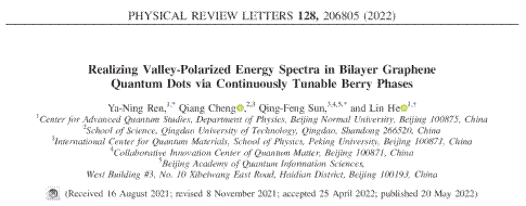 近日,理学院物理学科程强副教授与北京师范大学何林教授、任雅宁博士,北京大学的孙庆丰教授合作,在国际顶级期刊《Physical Review Letters》上发表了题为“Realizing Valley-Polarized Energy Spectra in Bilayer Graphene Quantum Dots via Continuously Tunable Berry Phases”的学术论文。程强与任雅宁为论文共同第一作者,何林和孙庆丰为论文通讯作者。这是我校首次在该物理学顶级期刊发表论文,实现了我校物理学科的历史性突破。该研究工作得到了国家自然科学基金委、国家重点研发计划、以及北京师范大学和北京大学的经费支持。