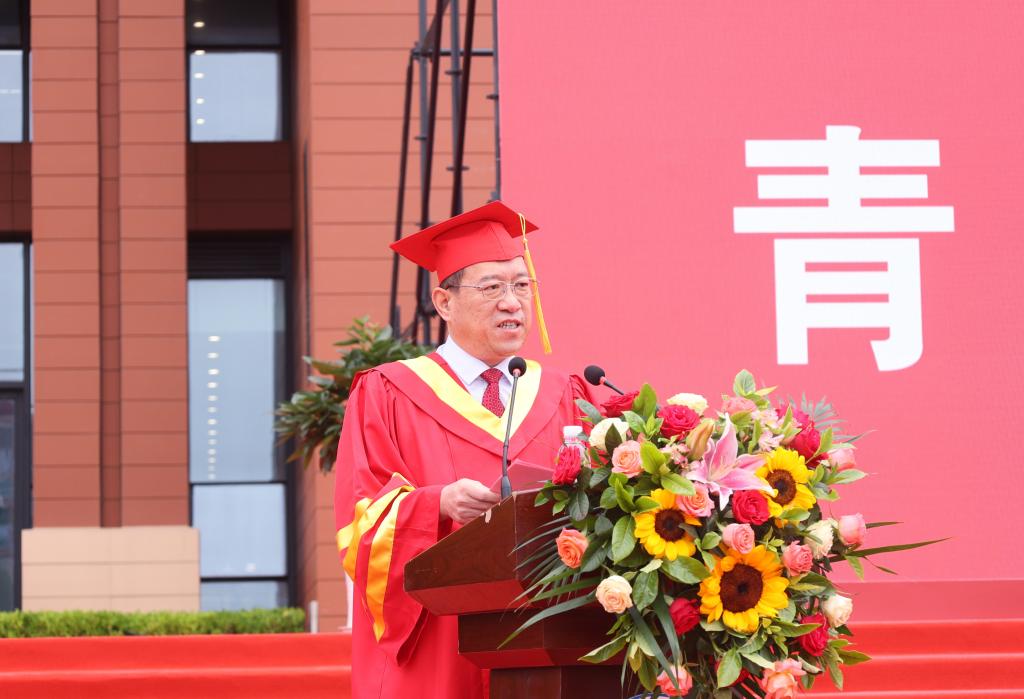 谭秀森在毕业典礼致辞中代表学校向顺利完成学业的2022届毕业生致以热烈的祝贺,向为毕业生们成长付出辛勤汗水的家长和老师们表示崇高的敬意和衷心的感谢。
