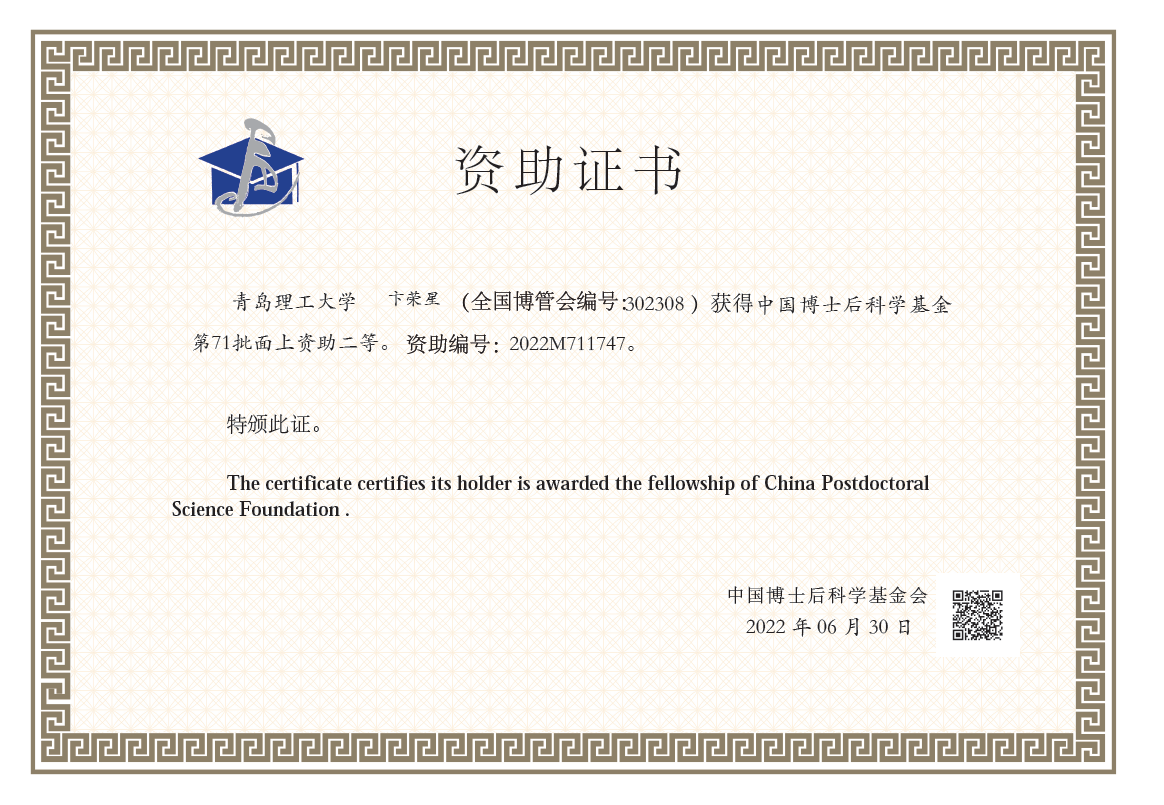近日,中国博士后科学基金会公布了第71批博士后科学基金面上资助获得者名单。我校环境与市政工程学院青年教师卞荣星(合作导师孙英杰教授)获第71批中国博士后科学基金面上二等资助。
