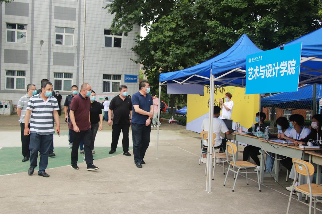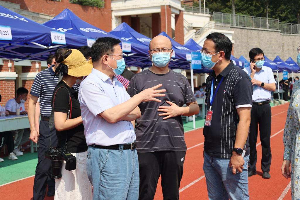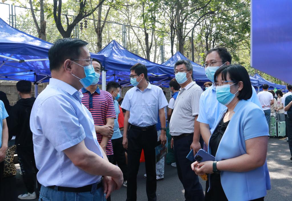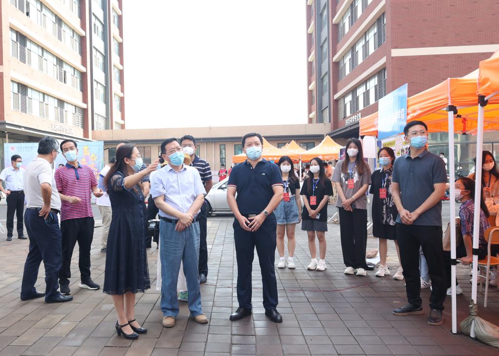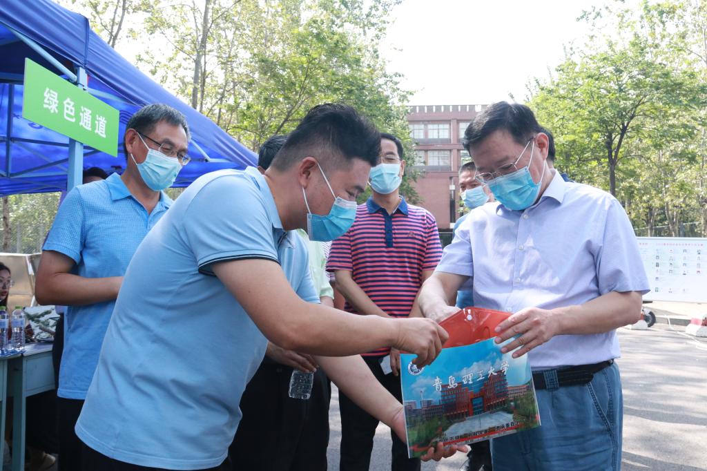 谭秀森一行深入西海岸新区主校区迎新现场,在校门口,直播大屏幕实时播放学生校内报到情况,让送行家长“沉浸式”体验学生报到流程,100余顶帐篷搭起的300米“风雨长廊”为新生报到保驾护航。