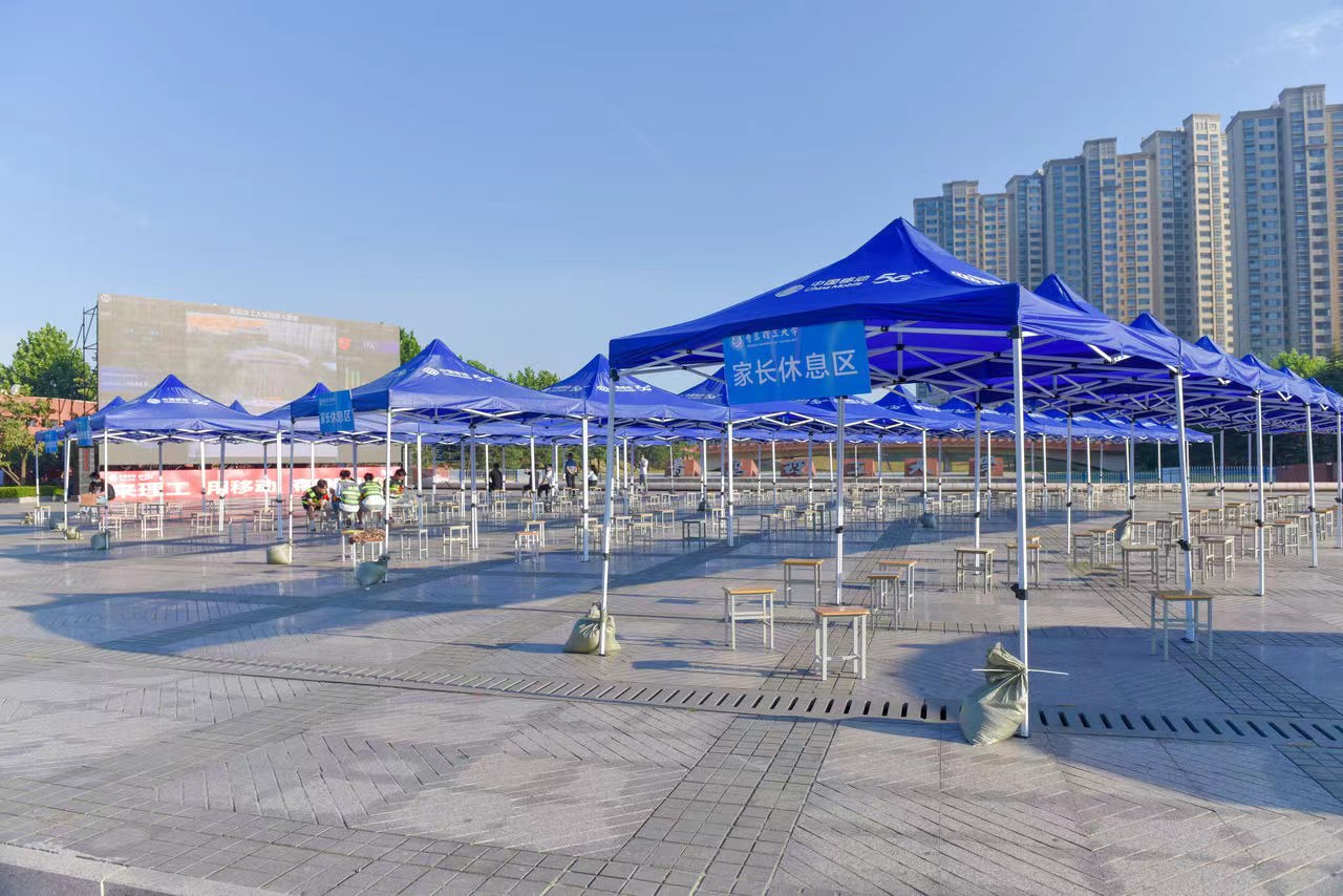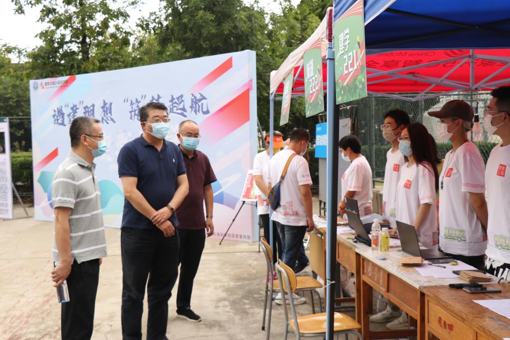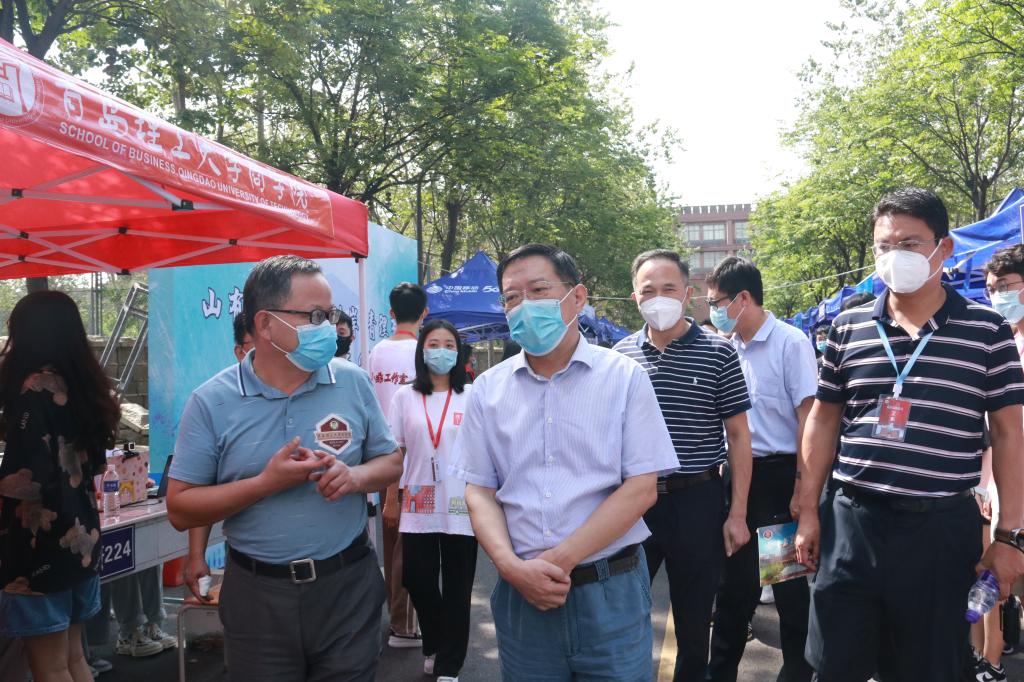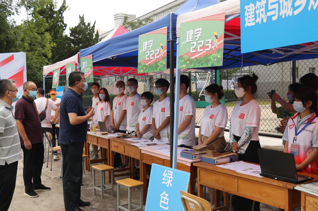 谭秀森一行深入西海岸新区主校区迎新现场,在校门口,直播大屏幕实时播放学生校内报到情况,让送行家长“沉浸式”体验学生报到流程,100余顶帐篷搭起的300米“风雨长廊”为新生报到保驾护航。