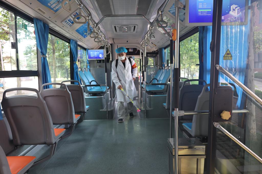 工作人员为公交车消毒