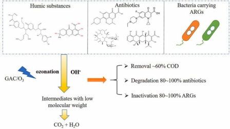 生活垃圾填埋场渗滤液浓缩液富含难降解污染物、抗生素、抗性基因(ARGs)等多种污染物,处理不当会产生潜在的生态环境风险。因此,同时且高效地去除浓缩液中多种污染物十分有必要。基于活性炭催化臭氧技术(GAC/O3)在有机污染物降解方面的优势,研究团队采用GAC/O3技术降解浓缩液中难降解污染物、抗生素和ARGs等多种污染物。研究结果表明,当GAC为4g/L、O3浓度为80 mg/min、初始pH值7.65时,COD和UV254去除率分别为55.7%和77.3%,同时可同步降解84%~100%的抗生素以及84%~100%ARGs。可见,GAC/O3技术可同时去除浓缩液中难降解有机物、抗生素及抗性基因等多种污染物。相关研究成果已被环境科学领域Top期刊Journal of Cleaner Production接收发表(DOI:10.1016/j.jclepro.2022.135016)。