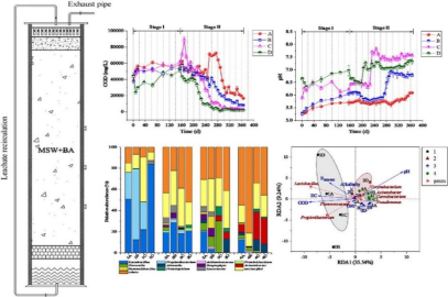 生活垃圾填埋过程中添加飞灰(BA)可以在一定程度上提升填埋场生物稳定性及渗滤液理化性质。然而,不同的BA添加比例会导致填埋场中微生物结构和丰度均显著变化,进而使得与微生物作用紧密相关的渗滤液产生、性质及其相关机制发生改变。针对这一问题,研究团队构建生活垃圾填埋场生物反应器,并通过将生活垃圾与不同比例BA混合(0%、5%、10%和20%)探究填埋反应过程中微生物群落结构演替规律以及渗滤液的理化性质的相应变化情况。研究结果显示:随着BA添加量的增加,微生物多样性增加、群落结构变化,但是其代谢途径受到抑制;与之相对应,渗滤液pH值迅速达到中性,ORP、COD、VFA、NH4+-N、Ca2+和SO42-降低,腐殖化速度提升。相关研究成果环境科学领域Top期刊Bioresource Technology接收发表(DOI:10.1016/j.biortech.2022.127720)。