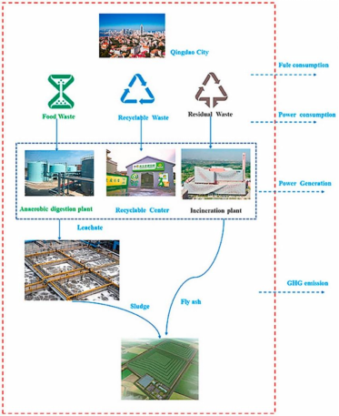 立足我国双碳战略和“无废城市”建设,研究团队以青岛市为例,采用生命周期评价法(LCA)和物质流生命周期清单研究了城市生活垃圾在不同处置模式下(包含生活垃圾分类)的碳排放情况。研究结果显示:传统的生活垃圾混合收集+填埋的处置模式,碳排放量最高(568.98 kgCO2-eq/t);生活垃圾分类收集+厨余垃圾厌氧发酵+其他垃圾焚烧模式下,碳排放量分别减少至4.27 kgCO2−eq/t;垃圾完全分类(厨余垃圾厌氧发酵、可回收物再利用和其他垃圾焚烧)模式下,碳排放量为−269.34 kgCO2−eq/t,可实现碳中和。因此,提升生活垃圾中可回收物的资源化再利用率是实现GHG减排行之有效的方法。相关研究成果已被环境科学领域Top期刊Journal of Cleaner Production接收发表(DOI: 10.1016/j.jclepro.2022.134275)。