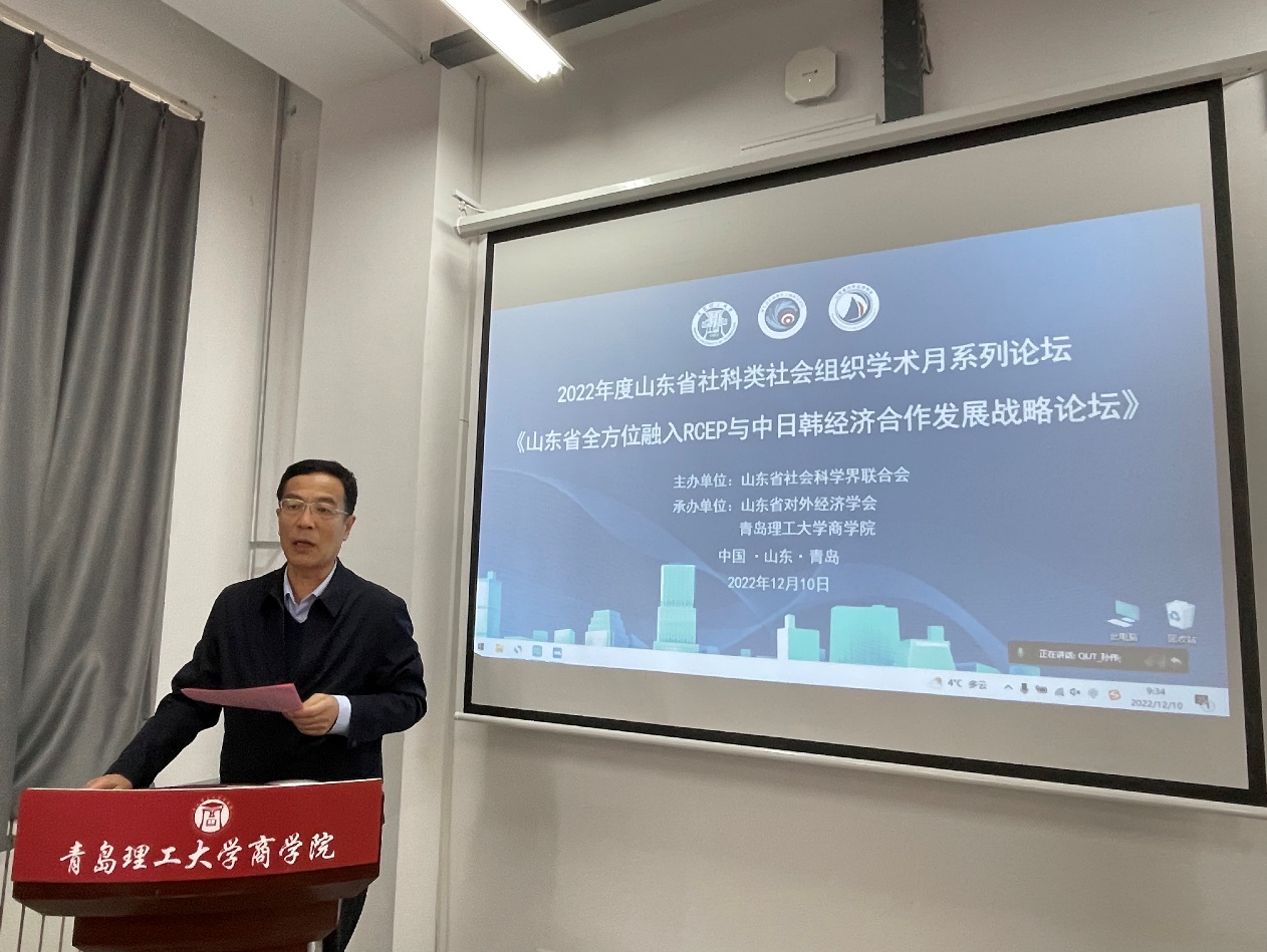 12月10日,2022年山东省社科类社会组织学术月系列论坛暨山东省对外经济学会2022年度年会,“山东省全方位融入RCEP与中日韩经济合作发展战略论坛”通过线上形式举行,会议由山东省社会科学界联合会、青岛理工大学主办,山东省对外经济学会、青岛理工大学商学院承办。山东省社科联二级巡视员徐青,青岛理工大学党委常委、副校长齐德义,山东省对外经济学会会长王培志,青岛理工大学商学院党委书记王粲等出席开幕式并讲话。商学院院长云乐鑫主持开幕式,山东省政府研究室、中国(山东)自由贸易试验区青岛片区管委会、山东省商务厅等单位领导及全省近100名师生参加会议。