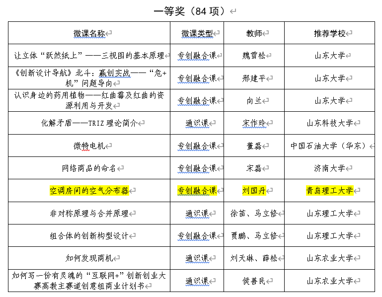 经学校推荐、省级初评和终评,共评选出创新创业类精品微课资源257项,其中特等奖42项、一等奖84项、二等奖131项,将全部纳入山东省高校创新创业类精品微课课程资源库,并向社会免费开放。