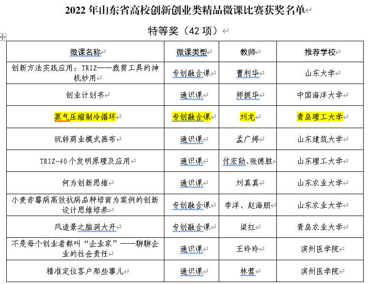 近日,山东省高校创新创业类精品微课比赛结果揭晓,我校环境与市政工程学院刘龙老师提交的“蒸气压缩制冷循环”荣获特等奖、刘国丹老师提交的“空调房间的空气分布器”荣获一等奖,是学校创新创业类课程资源建设的又一佳绩。