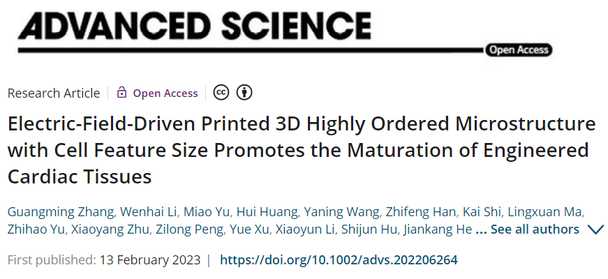 近日,机械与汽车工程学院山东省增材制造工程技术研究中心联合苏州大学心血管病研究所、西安交通大学、青岛大学附属医院等多家单位,在电场驱动喷射微3D打印组织工程支架方面取得重要进展,相关研究成果以“Electric-Field-Driven Printed 3D Highly Ordered Microstructure with Cell Feature Size Promotes the Maturation of Engineered Cardiac Tissues”为题,发表在国际高水平期刊《Advanced Science》(中科院大类一区, IF 17.521)。我校张广明副教授和李汶海硕士为论文共同第一作者,兰红波教授为通讯作者,青岛理工大学为第一署名通讯单位。该成果具有典型的“医工结合”特色,也是我校首次在该领域发表成果。