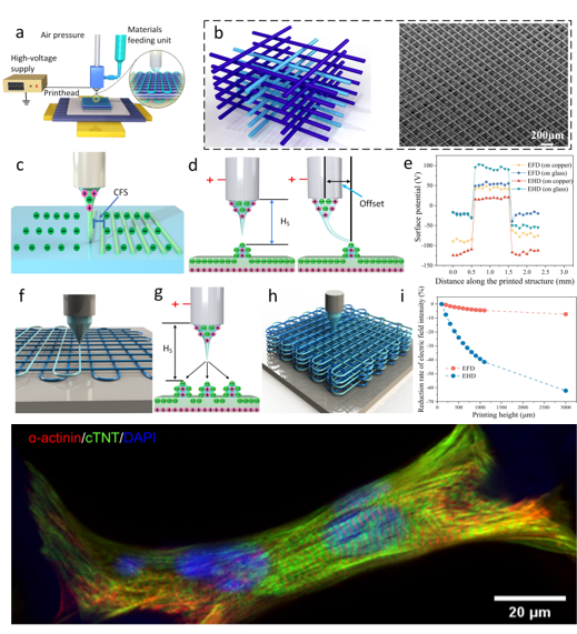 近年来,随着组织工程的不断发展,组织工程支架作为其中最有效的治疗手段之一,在生物医学方面呈现出巨大的应用前景。组织工程支架的结构和尺寸(纤维直径和纤维间距)对细胞的生长和成熟起到至关重要的作用。为了开发更符合组织工程需求的生物支架,该成果提出了电场驱动喷射微3D打印具有细胞特征尺寸有序3D支架的新方法。该方法借助于电场驱动喷射微3D打印独特的电场生成方式,有效克服了射流排斥影响,并结合对称打印等策略,成功制备了纤维直径为10 ~ 20 μm、间距为60 ~ 80 μm高度有序的三维支架,实现了目前报道的最大纤维直径/间距比0.29。人诱导性多能干细胞(Human induced pluripotent stem cell,hiPSCs)来源的心肌细胞培养和动物实验结果表明该支架在形成同步功能工程心脏组织及促进其成熟方面具有显著优势,显示出巨大的心脏组织工程应用潜力。