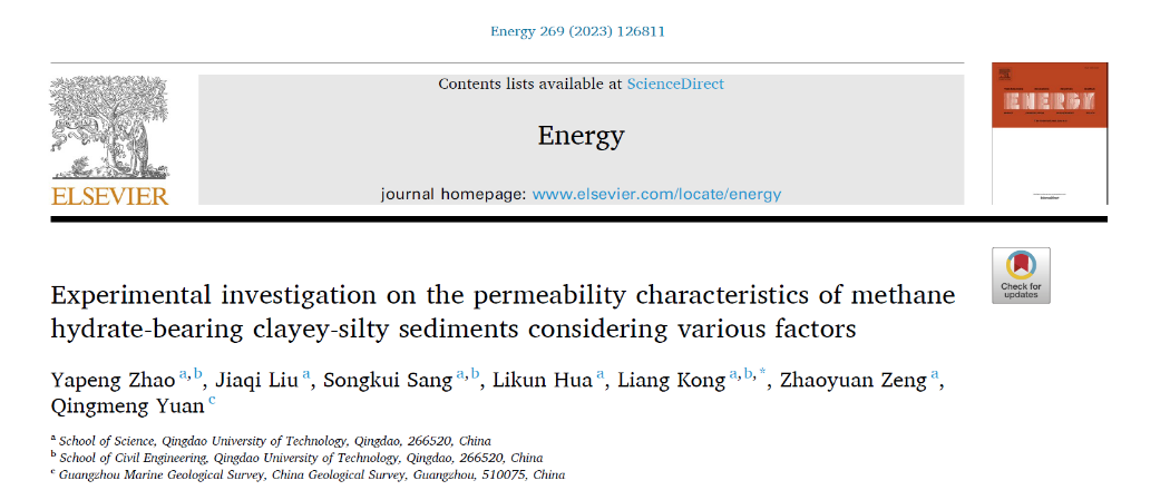 近日,理学院岩土力学与海洋岩土工程团队联合广州海洋地质调查局在能源土(含天然气水合物沉积物)力学-渗流耦合方面取得重要进展,相关成果以“Experimental investigation on the permeability characteristics of methane hydrate-bearing clayey-silty sediments considering various factors”为题,发表在国际能源领域权威期刊《Energy》(中科院大类、小类一区,IF 8.86)。我校博士生赵亚鹏为论文第一作者,孔亮教授为通讯作者,青岛理工大学为署名通讯单位。