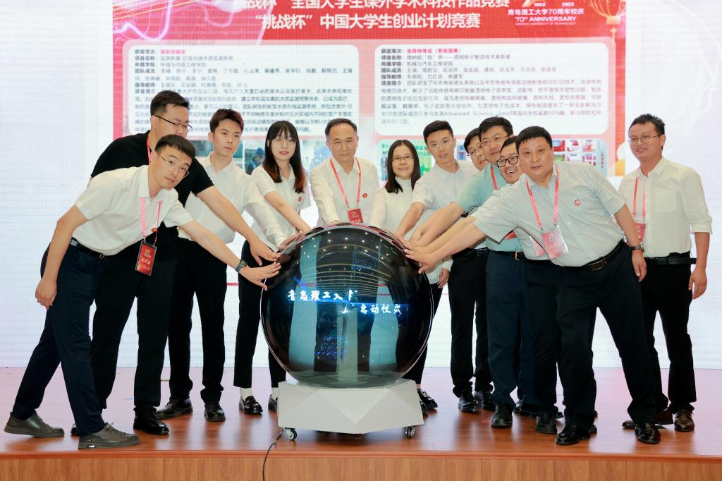 在来自全国各地校友会校友共同见证下,党委副书记李国华,青岛市邮政公司党委书记、总经理周军共同发布了70周年校庆倒计时100天纪念封;党委副书记杨兴昌,优秀毕业生代表王辛馨、费军洁、谢凯共同发布了70周年校庆标识;党委常委、纪委书记、监察专员尹东峰,优秀学生和学生干部代表曾凡斌、明玉珍共同发布了70周年校庆吉祥物;党委常委、副校长王在泉为“70年70站”校庆接力活动授旗,学校男子排球队队长吴坤臻接旗;党委常委、副校长李长河为70周年校庆志愿者服务队授旗,校庆志愿服务队负责人王柯涵接旗;副校长金祖权,获高水平科技成果教授代表赵正旭、贺可强、毕学军共同启动科技成果展示活动;老领导赵铁军,获优秀教学成果教师代表张冬梅、朱一荣、孙林娜共同启动教学成果展示活动;党委常委、组织部部长郭建锋,优秀科技创新指导教师代表李泉涛,科技创新获奖学生代表高腾、李峰、张艺婷共同启动了学生科技成果展示活动。
