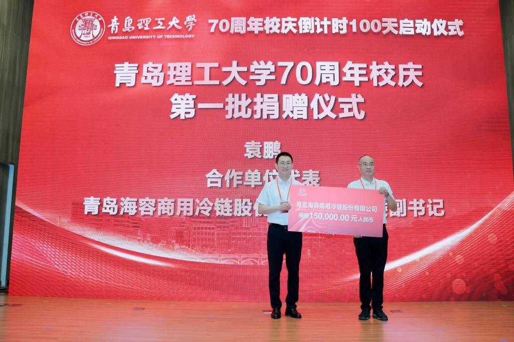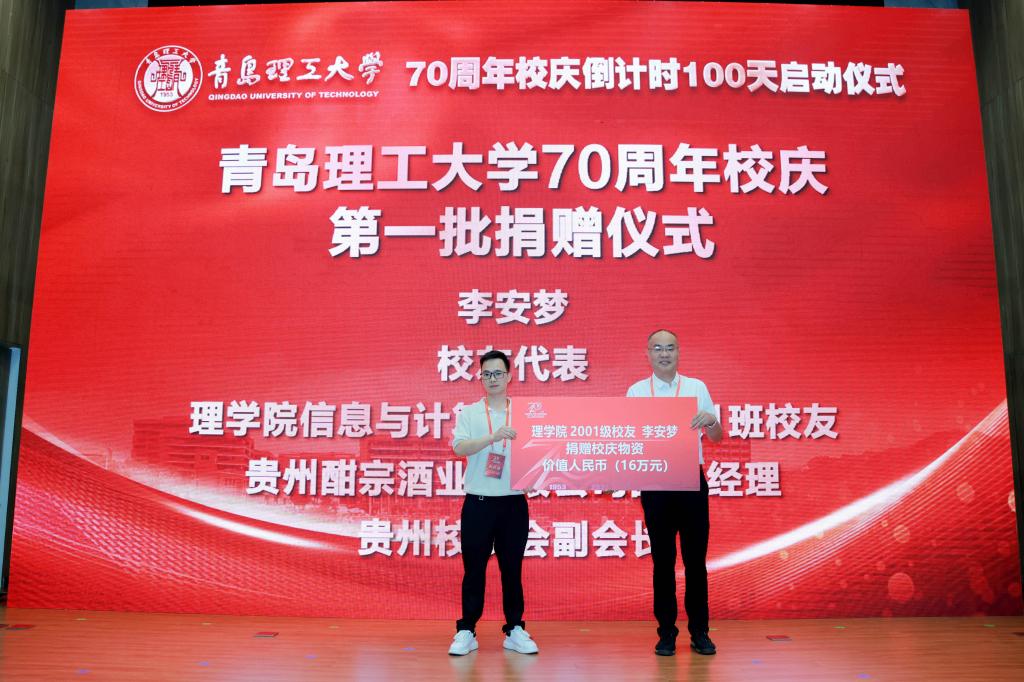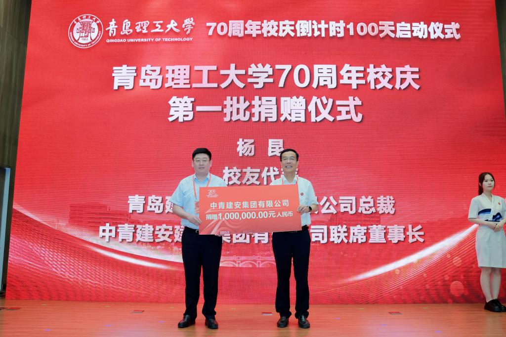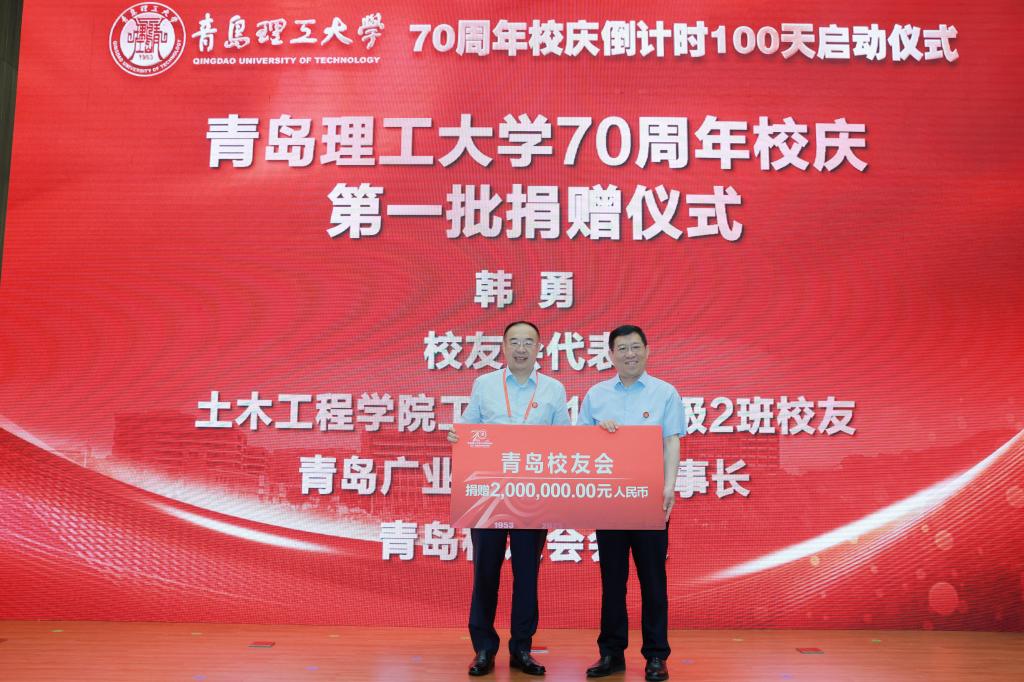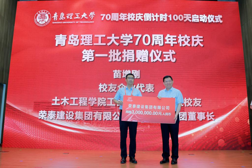 启动仪式上还举行了70周年校庆第一批捐赠仪式。校友企业代表、土木工程学院工民建1994级1班校友、荣泰建设集团有限公司工程建设集团董事长苗增刚,校友会代表、土木工程学院工民建1987级2班校友、青岛广业投资公司董事长、青岛校友会会长韩勇,校友代表、信息与控制工程学院电子信息工程2003级1班校友、青岛建安控股集团有限公司总裁、中青建安建设集团有限公司联席董事长杨昆,合作单位代表、青岛海容商用冷链股份有限公司党委副书记袁鹏,校友代表、理学院信息与计算科学2010级1班校友、贵州酣宗酒业有限公司副总经理、贵州校友会副会长李安梦分别向学校捐赠。校长谭秀森,学校校友总会副会长齐德义,党委常委、统战部部长陈伟分别代表学校接受捐赠并颁发捐赠证书。