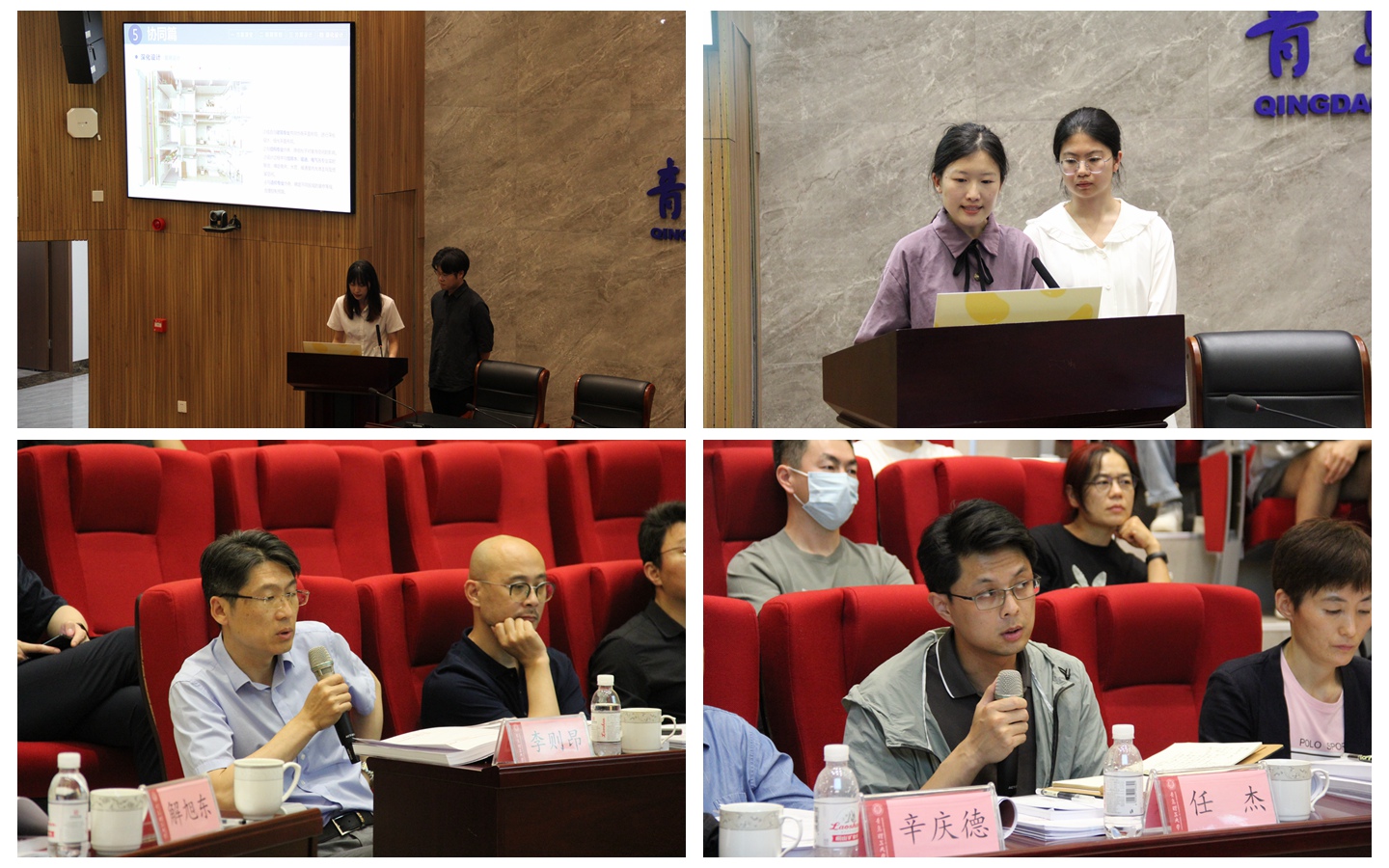 答辩评审委员会由UDG联创设计酒店产品总建筑师李则昂、中国会展经济研究会艺术与科技委员会副主任王云童、青岛义和钢构集团有限公司总工程师于风波、青岛腾远设计事务所有限公司综合七院副院长兼机电所长梁斌、青岛市建设工程施工图设计审查有限公司专业总工于敬亮、源海项目管理咨询有限公司事业部总经理张丽丽、中建八局第四建设有限公司设计管理研究院总机电师王欣等7位校外专家,以及学校科技发展集团建筑设计研究院的建筑总工王云云、室内设计所所长任杰、结构总工辛庆德、暖通总工张训玉、给排水总工张宗利、电气总工袁红卫等6位校内专家组成。