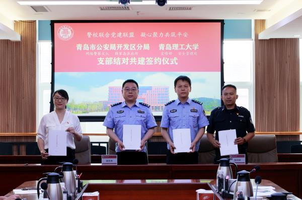 随后,青岛市公安局青岛经济技术开发区分局网络警察大队党支部、薛家岛派出所党支部及青岛理工大学宣传部党支部、安全管理处党支部共同签署支部结对共建协议书。