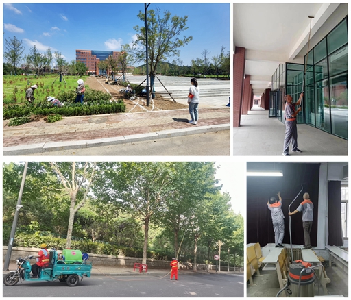 校园里,校园与物业服务中心坚持绿化保洁毫不松懈。校园绿植补植补种工作开展有序,累计完成平整松土2500余平米,栽种麦冬草草皮1200余平米,播撒草种500余平米,栽种大叶黄杨、小叶黄杨以及红叶石楠等灌木1500余平米,不断推进校园绿化提质。校园环境卫生治理成效显著,在坚持例行楼道清洁、校园保洁,垃圾清运、道路清扫工作不停歇的基础上,进一步加大校园及楼宇卫生死角清理,进一步加强夏季施肥和灌溉管理,针对性地开展枯枝修剪和病虫害防治工作,积极推进校园美化增效,以各项精心细致的工作,努力为师生学习生活和校庆工作开展营造优美整洁温馨的校园。