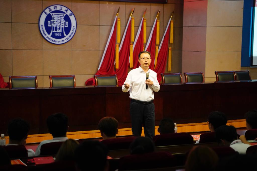 王在泉为全体SQA项目新生讲“开学第一课”,并简要介绍了学校的办学历史和特色。他说,今年恰逢学校建校70周年,70年来,学校为国家培养了25万名优秀毕业生。学校浓厚的学术氛围给大家创造了良好的学习环境,希望同学们利用好学校的资源,通过在青岛理工大学三年的全日制学习,能够具备熟练地运用英语掌握相关专业的知识和技能,之后选择理想的国外大学继续深造。他对同学们提出三点希望:一是要践行“百折不挠、刚毅厚重、勇承重载”的理工精神,全心融入青岛理工大学,明确人生目标,提升个人境界。二是要培养学习的自觉性和自律性,熟悉国外的授课形式,吸取先进的教学理念,学贯中西,留学报国。三是要养成良好的学习习惯,直面挑战、迎难而上、砥砺前行,练就过硬本领、实现青春梦想。