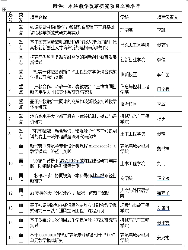 近日,山东省教育厅发布《关于公布2023年本科教学改革研究项目立项名单的通知》,我校推荐的15个项目全部入选,其中,重点项目8项,面上项目7项,连续三年立项率达100%。本次我校申报的教改项目,主要集中在高水平专业建设、课堂教学改革、人才培养、创新创业教育等方面。