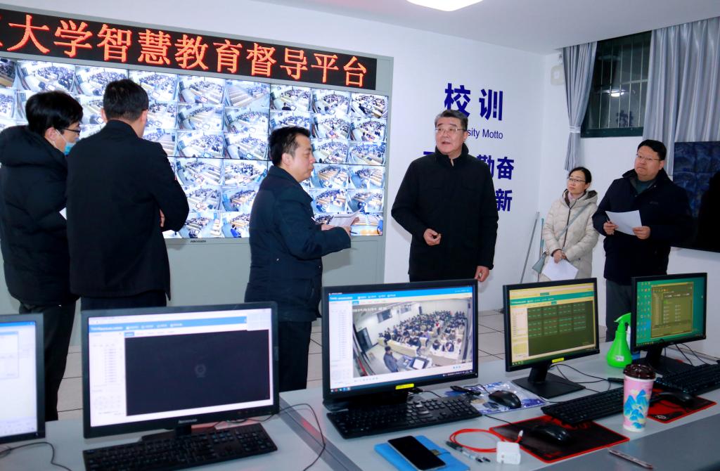 上午8点,王亚军一行实地查看了教学监控室、开课教室等场所,对教师到岗、学生出勤、师生精神面貌、课堂秩序、课堂效果、设施保障、设备运行等情况进行了全面检查,就加强教学信息化建设、优化排课教室安排、多部门联动保障教学等方面提出了要求。