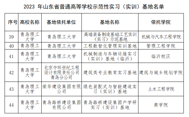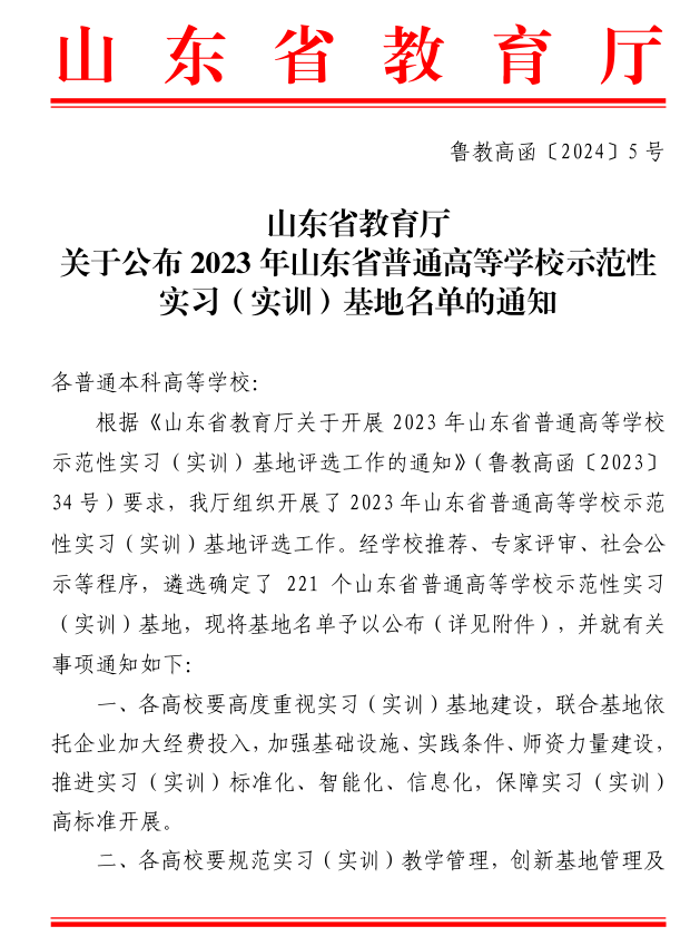 近日,山东省教育厅发布《关于公布2023 年山东省普通高等学校示范性实习(实训)基地名单的通知》(鲁教高函〔2024〕5 号),全省遴选确定了221 个山东省普通高等学校示范性实习(实训)基地,我校申报的6个山东省示范性实习(实训)基地全部获批。