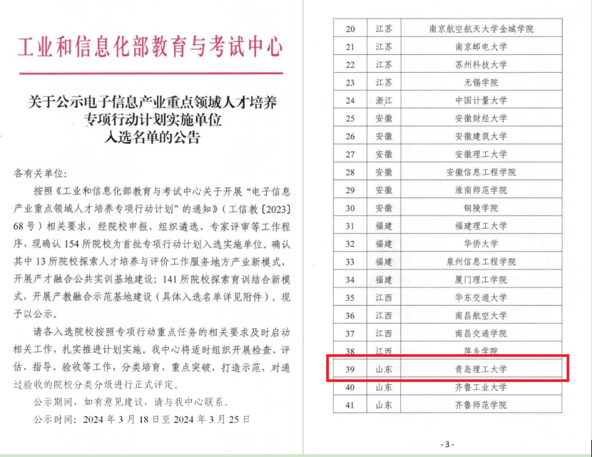 3月18日,工业和信息化部教育与考试中心发布《关于公示电子信息产业重点领域人才培养专项行动计划实施单位入选名单的公告》,确定154所院校为首批专项行动计划入选实施单位,我校以电子信息工程、通信工程、机器人工程和计算机科学技术四个专业为支撑,获批“电子信息产业重点领域人才培养专项行动计划”实施单位。