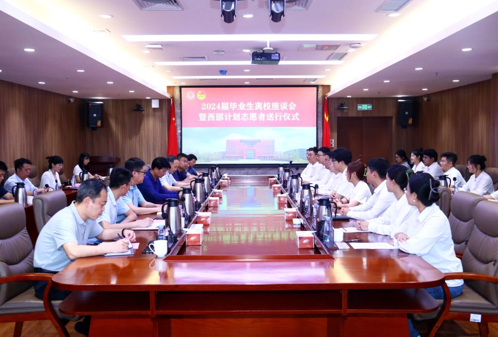 6月11日下午,学校召开2024届毕业生座谈会暨西部计划志愿者送行仪式,校长张凯出席会议并讲话,党委常委、副校长郭建锋,以及党政办公室(巡察工作办公室)、宣传部、学生工作处、研究生处、教务处、合作发展处、信息化建设与管理处、后勤管理处、团委、图书馆等部门负责同志参加座谈,来自各学院的本科,硕、博士毕业生,西部计划志愿者代表22人参加会议,会议由郭建锋主持。
