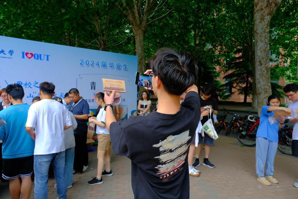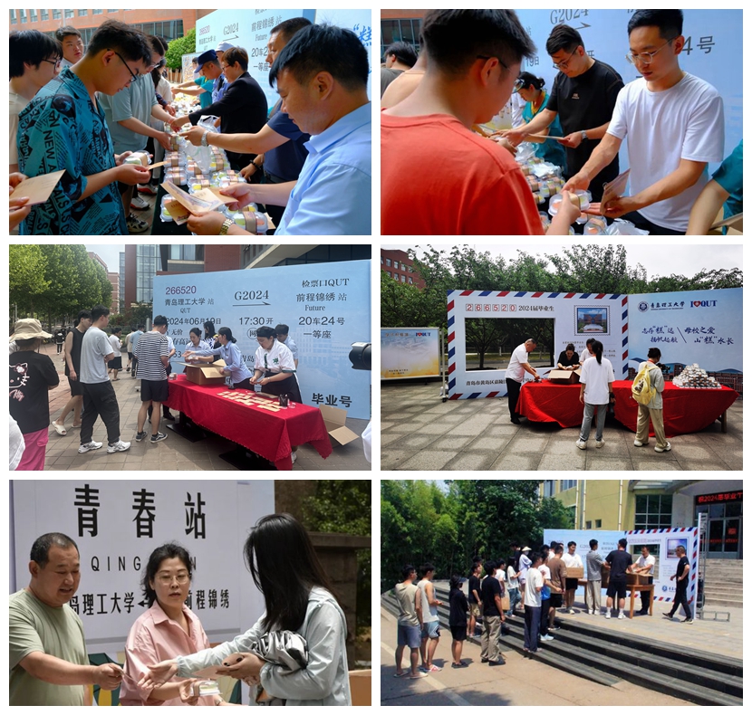一张青岛理工大学“毕业号”高铁票,和写着“青春站”的车站牌,承载着学校教职工老师们对2024届毕业生们浓浓的祝福和期盼。大学四年时光转瞬即逝,“毕业号”列车正缓缓驶入站台,在“车站”现场,学校的辅导员、班主任、食堂师傅、宿管阿姨、保安师傅等教师员工们化身“列车员”纷纷走上前台,亲手为毕业生们分发学校专属毕业礼物——绿豆糕。糕点上面刻有学校标识和“2024鼎新筑梦”的字样,寓意着毕业生们将带着母校的爱与祝福,秉承“百折不挠、刚毅厚重、勇承重载”的理工精神,继续勇攀高峰,开创属于自己的精彩人生。这份礼物不仅代表着夏日的清凉,更象征着对毕业生们“志存高远,扬帆起航”的殷切希望和“母校之爱,山高水长”的深深牵挂。