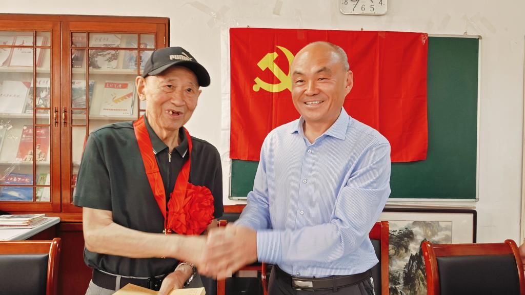 李长河为获得“光荣在党五十年”纪念章的老党员佩戴大红花、颁发纪念章,并与老党员合影留念。50年峥嵘岁月、50载初心如磐,沉甸甸的纪念章见证着为了信仰的无悔奋斗。随后,全体党员面向党旗重温入党誓词,庄严宣誓,表达对党的绝对忠诚和无限热爱。