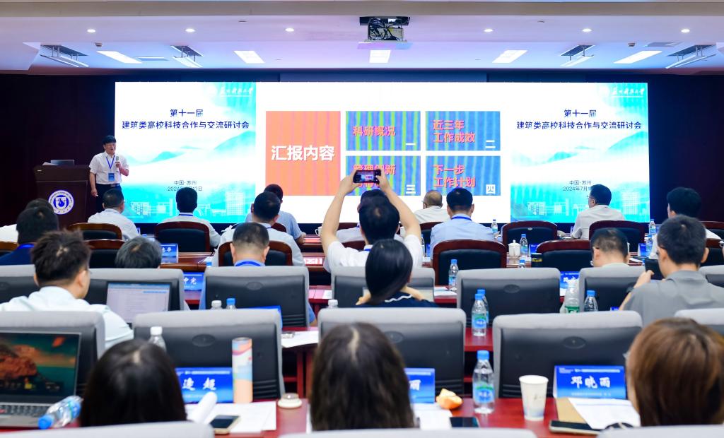7月13日,以“加强高校有组织科研,助力发展新质生产力”为主题的第十一届建筑类高校科技合作与交流研讨会在苏州科技大学召开。来自西安建筑科技大学、沈阳建筑大学、北京建筑大学、山东建筑大学、青岛理工大学、安徽建筑大学、吉林建筑大学、天津城建大学、河北建筑工程学院、苏州科技大学等十所建筑类高校分管科技工作的校领导,以及科技工作相关工作人员参加了会议。我校副校长金祖权教授率科技处相关人员参会,住房和城乡建设部、江苏省教育厅等部门相关负责人出席会议。