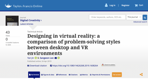 近日,艺术和人文引文索引(A&HCI)Digital Creativity期刊发表我校艺术与设计学院产品设计专业金燕博士的最新成果《Designing in virtual reality: a comparison of problem-solving styles between desktop and VR environments》(doi.org/10.1080/14626268.2019.1608264)。