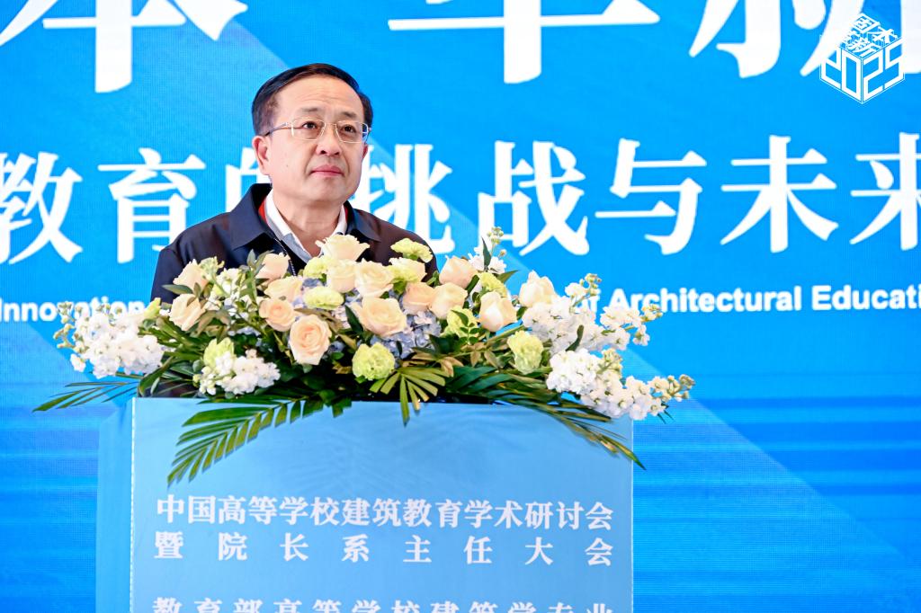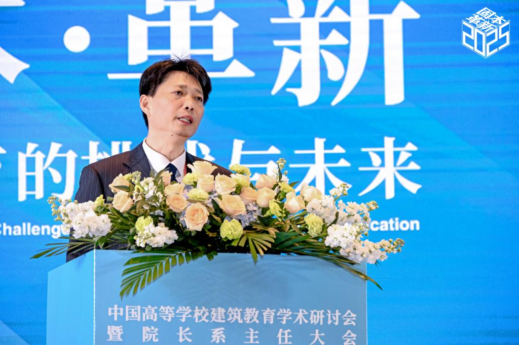 王建国致辞并作了建筑学专业教学指导分委员会2025年度工作报告。他对学校为会议举办提供的支持表示感谢,并介绍了大会六大专题设置。他从虚拟仿真技术在建筑学实验教学能力培养中的能力图谱构建等七个方面,系统阐述了分委会年度重点工作。他指出,当前中国建筑教育正处于转型发展的关键阶段,面临新的机遇和挑战,并围绕建筑专业教育评估与人才出口标准优化、人才培养模式创新提出前瞻性建议。