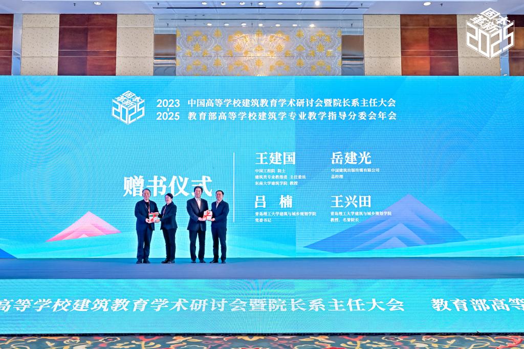 王建国院士、中国建筑出版传媒有限公司总经理岳建光向青岛理工大学建筑与城乡规划学院赠书