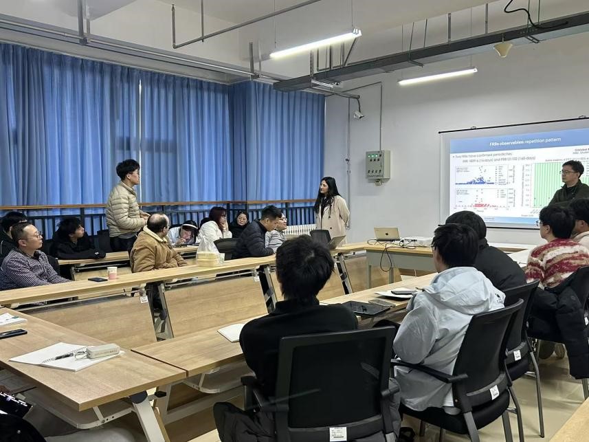 射电暂现源(包括脉冲星、快速射电暴等)是当前天文学领域的研究热点,其多数观测集中于厘米波段,而毫米波段的观测突破不仅能揭示其辐射跃迁的关键规律,更可将快速射电暴的探测范围拓展至8GHz以上,为相关研究打开新维度。报告中,Cruces教授结合自身团队的核心研究成果,重点介绍了采用阿塔卡马大型毫米波/亚毫米波阵列(ALMA)相控阵模式的创新应用——该模式能实现相当于80米以上口径射电望远镜的超高灵敏度,大幅提升快速射电暴的探测效率与精度,其前沿技术思路令在场师生深受启发。