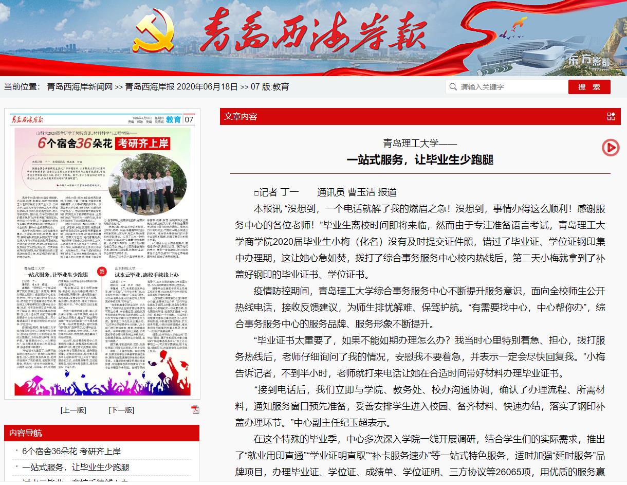 青岛西海岸报:青岛理工大学——一站式服务,让毕业生少跑腿
