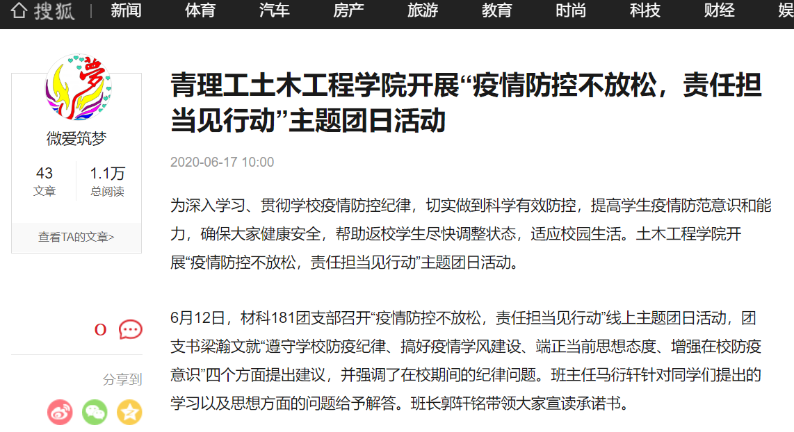 搜狐:青理工土木工程学院开展“疫情防控不放松,责任担当见行动”主题团日活动
