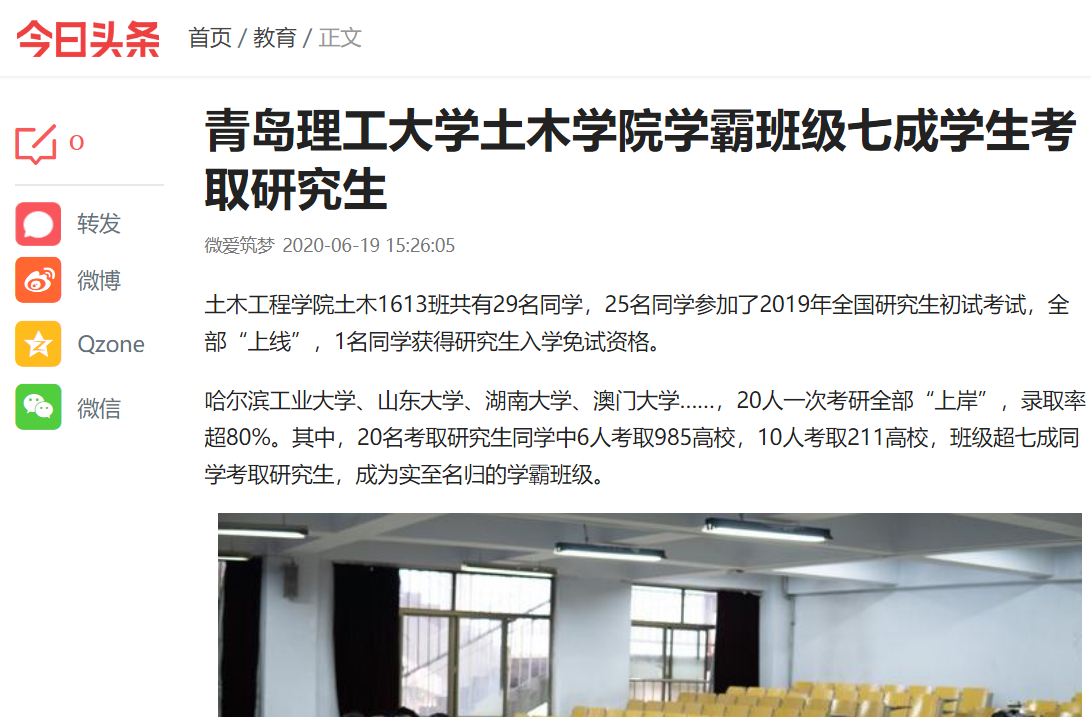 今日头条:青岛理工大学土木学院学霸班级七成学生考取研究生